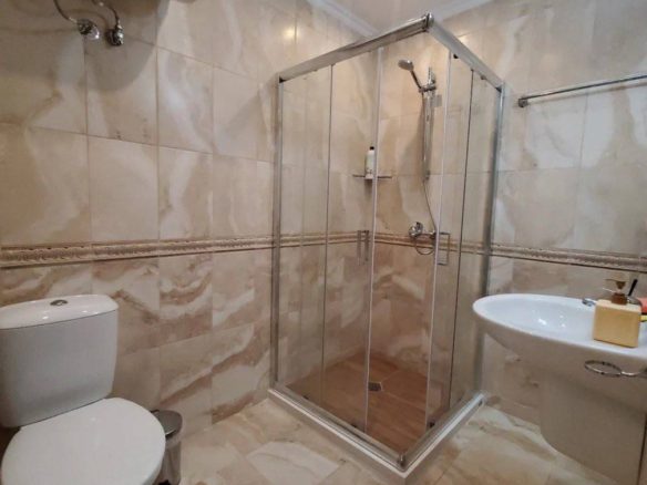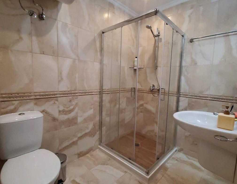 Совмещенный просторный санузел, оборудованный душевой кабиной.