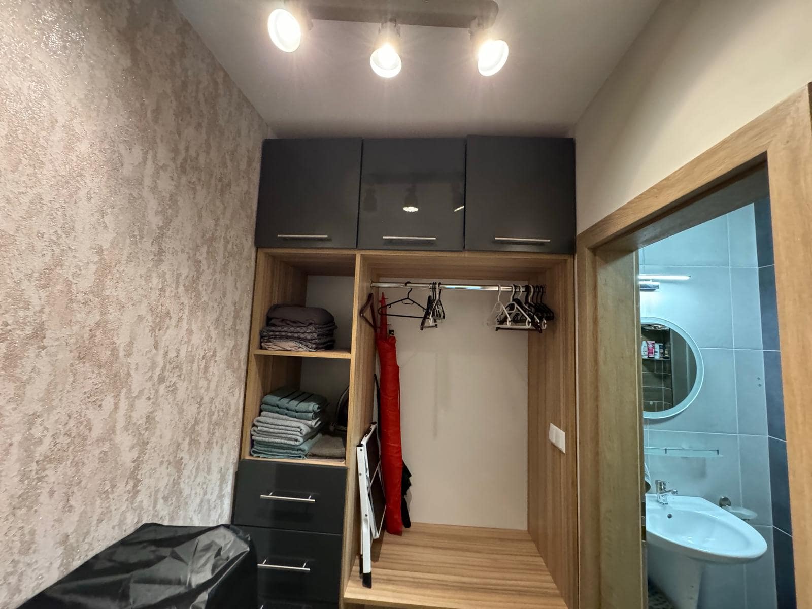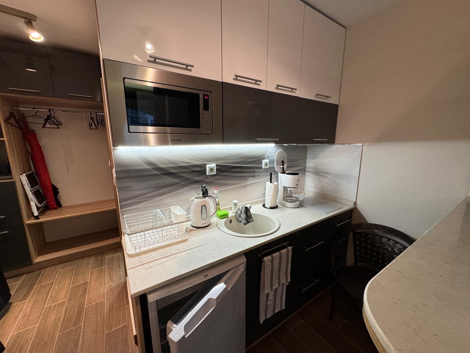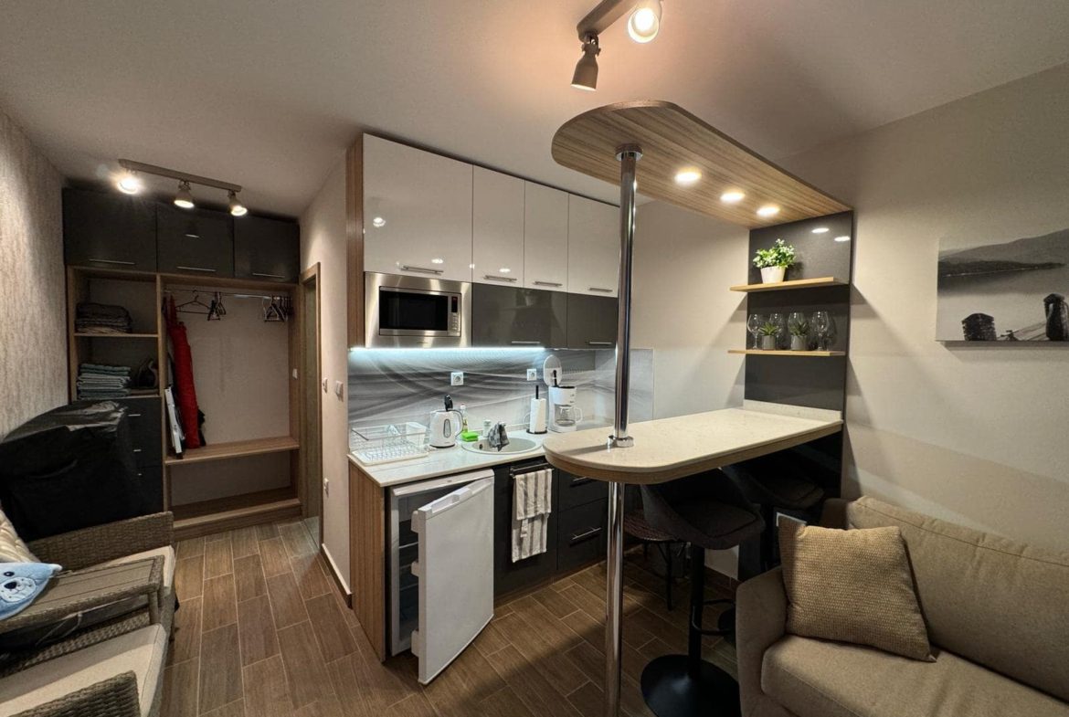 Совмещенный санузел оборудован душевой кабиной, комната студия с зоной кухни, мини патио с выходом, компактное пространство для прихожей.